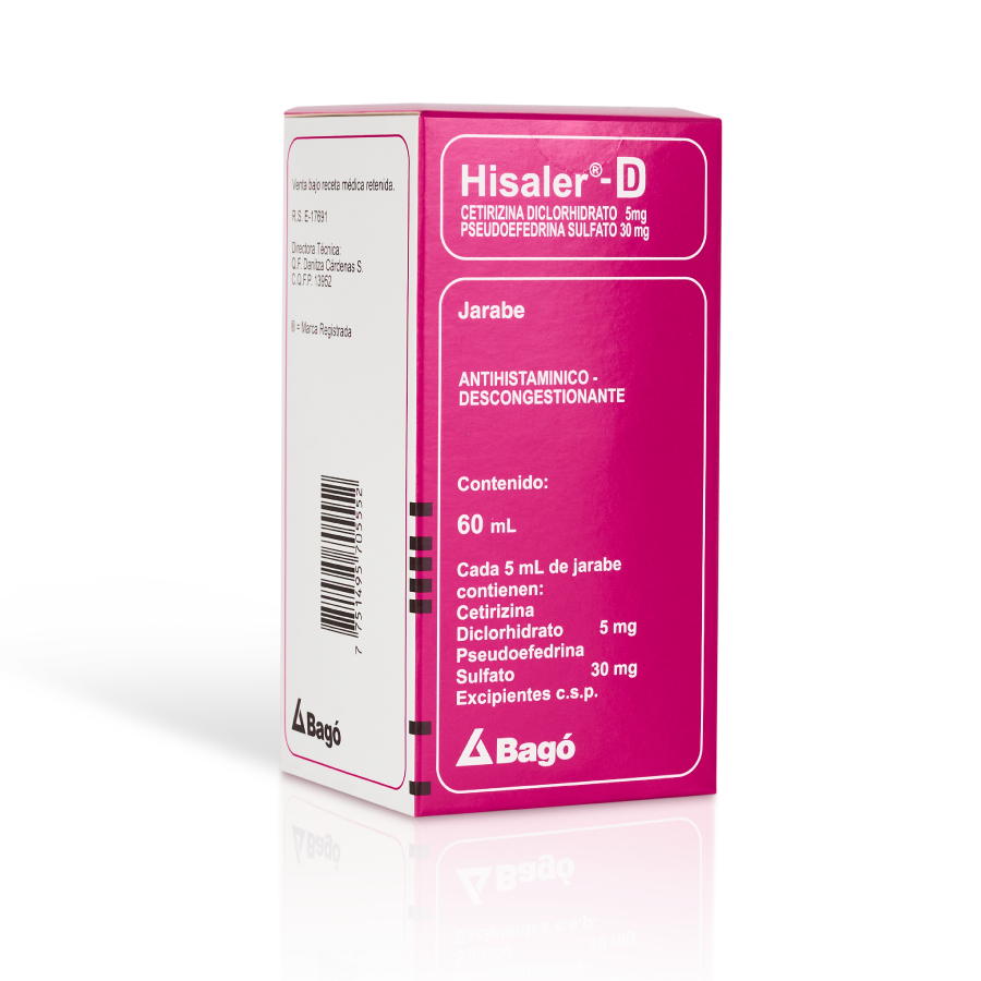 Cetirizina 5 mg + Pseudoefedrina 30 mg / 5 mL / R.S.: EE-07812 / Laboratorios Bagó del Perú S.A. RUC: 20160641810.
